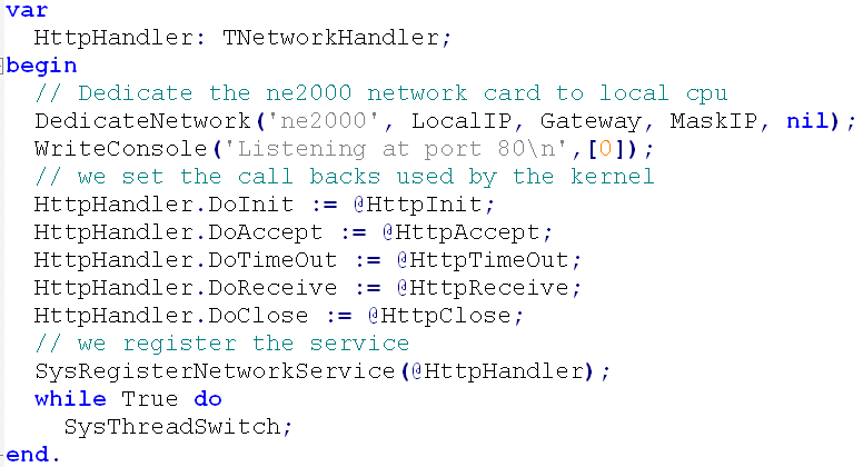 Let's first discuss the code of ToroHttp.pas (see Figure 1). This is the main program. It defines the network handler, i.e., HttpHandler. Then, it sets the right methods, e.g., DoInit(), DoAccept().