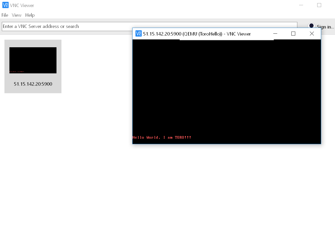 Hi folks! this weekend I deployed a TORO guest in the Scaleway's Cloud. This can be checked by connecting a VNC client to  51.15.142.20:5900